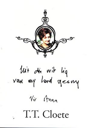 Uit die wit lig gesny Translated: Cut from the white light of my country, for Anna , by T.T. Cloete by M. BijmanFebruary 21, 2016 Comments 0 0 comments on “Uit die wit lig gesny” Say something Δ Post navigation Previous Post