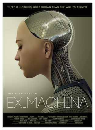 Poster from the film Ex Machina. The sexbot in the film is not “Ava”, played by Alicia Vikander, whose image is on the poster, but “Kyoko”, played by Sonoya Mizuno.