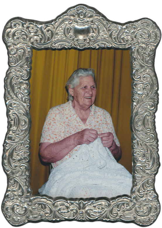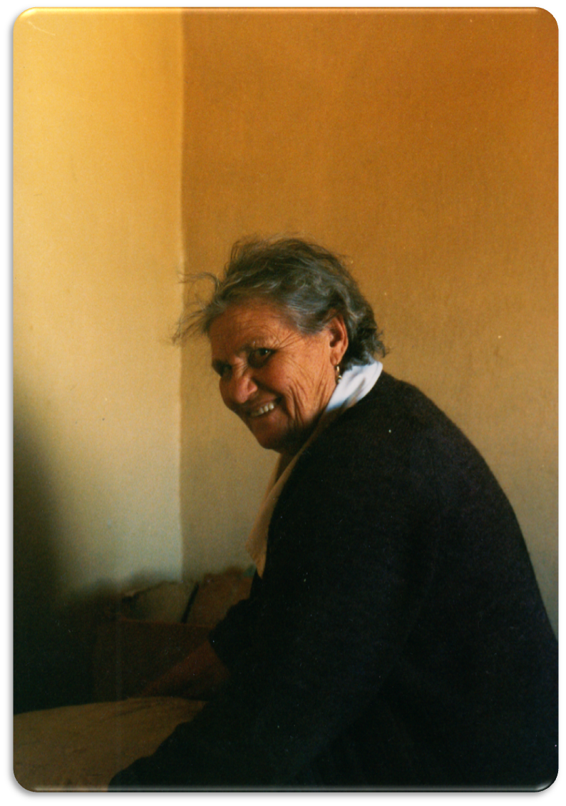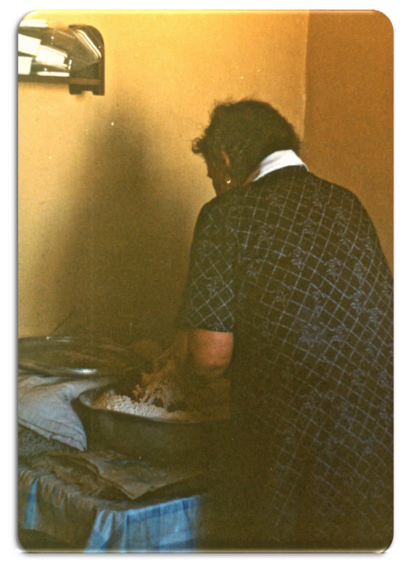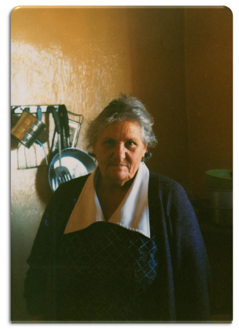 Walking down the cool gloom of the stoep with cracked cement underfoot, into the small kitchen outside, I see bars of sunlight streaming wide with dancing flour motes, from the hands of my Grandma, who's filling pans of petrol cans, cut down half-size, with creamy bread dough on the rise, for the mud brick oven up the hill. She glances at me, kneading still, says Gee dan vir Ouma die skottel, Marthatjie. And then, as often in dreams of things that we lose, miss, rediscover and collect, for scarcity in retrospect, I reach again to the oilcloth-covered table and pick up the old flowered basin of enamel, and see in her face, so like my own, the sober stare, the heavy bone, the bloodline that forever ties us with looks and places, times and vistas.
