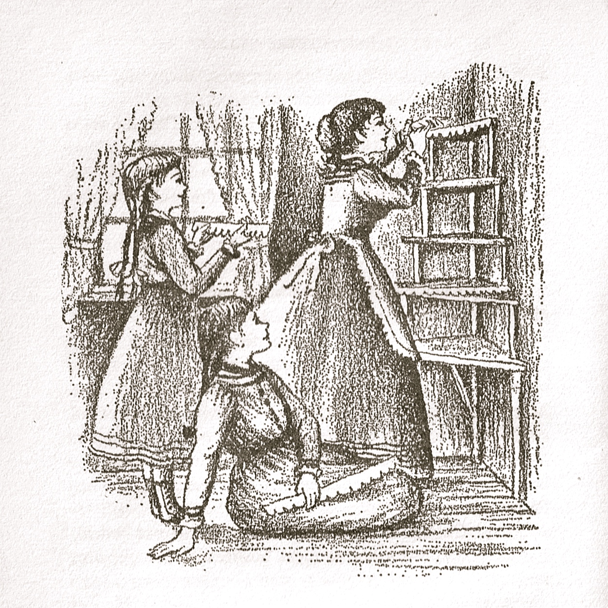 Illustration by Garth Williams of Ma Ingalls, Laura and Mary in “By the Shores of Silver Lake”, by Laura Ingalls Wilder. (Puffin Books ed., 1967)