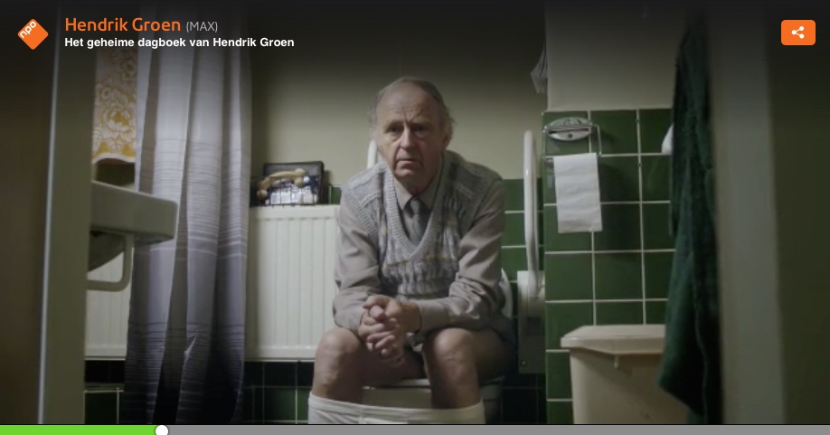 Hendrik (actor Peter de Smet), contemplating life and the problems of digestion in old age. (Still from the TV series, in Dutch). No this is not rude – they do a lot of talking about pooping and peeing in the book.