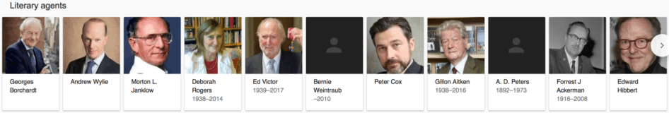 Literary agents, and the agencies they are part of, are listed in both handbooks I consulted (left), and with the various unions or guilds representing writers. But therein lies another problem – you have to find your match. Literary agents, like actors’ agents, are people who have multiple skills. Many have one leg in publishing and another in the world of writing, and some are writers or editors themselves. They bring publishers and writers together. If they have a good “eye”, they can bring an unknown, but talented, author to the attention of the world. Generally, you would not know their names. A famous few are: