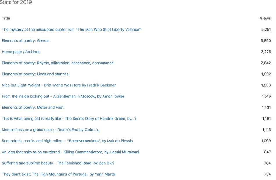 The past year has shown a 50.71% growth in views and visitors. From 2016 to 2018, the growth was huge, but has now stabilized to a more realistic rate. Whether this has a correlation with the reduced number of posts, I do not know. I understand that unless I post more controversial, shorter and more emotional posts, on more commercial, current subjects, there will not be more views or visitors – since that is the way search engines and social media work. But since I really do not care about likes, or about how big this thing gets, I never will. If there is one lesson I have learned this year it is that writing a book is so hard, so fraught with opportunity for failure, that I should really be cautious about shooting down anything. I will, like Nick Cave, try to cultivate a quiet conversation with visitors to the site.