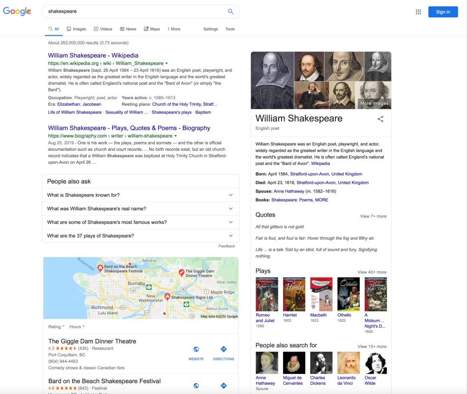 There are some good taxonomies on academic websites, and Wikipedia, but considering the size of the body of knowledge, these have been broken down into discrete, unconnected subject matter areas. In the case of Wikipedia, the links in these separate taxonomies only refer internally to Wikipedia’s own contents, and are therefore constrained. Google and other search engines have this exact function, unconstrained (a Google search for “Shakespeare” produces about 262,000,000 results in 0.73 seconds, from maps to plays to movies to people with the same surname) but the results are not hierarchical according to the relation of terms to each other – they are organized in order of popularity of search-and-find. To find, let’s say, the meaning of “Romeo’s” speech in Act so-and-so of Romeo and Juliet would take many more drill-downs using precise search words.