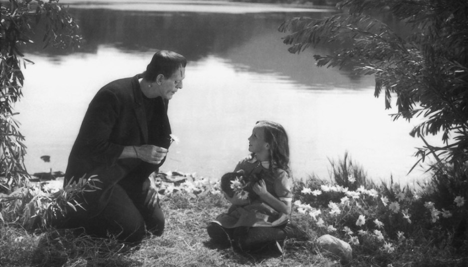 Boris Karloff portraying “the creature” in the 1931 film Frankenstein. With this, the creature or monster became permanently associated with the image of a tall man with a bolt through the neck, visible stitching, an unhealthy pallor, a lurching walk, and clunky boots. And angry villagers with pitch-forks and flaming torches. It also contributed to people naming the creature, rather than the doctor, “Frankenstein”. (Source: Encyclopedia Britannica, Frankenstein, 1931, directed by James Whale, with Boris Karloff as the creature and Marilyn Harris as the little girl. Image from Universal Pictures Company Inc. Image in private collection.)
