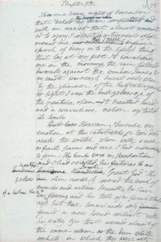 A page from the draft of the handwritten manuscript of Frankenstein by Mary Shelley: “It was on a dreary night of November that I beheld my man completed. With an anxiety that almost amounted to agony, I collected instruments of life around me that might infuse a spark of being into the lifeless thing that lay at my feet.” (Image: public domain)