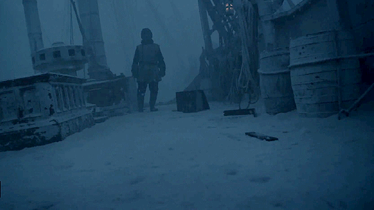 A moment from Season 1 of The Terror, in which a sailor is confronted by the “Tuunbaq”. Someone is about to have their head ripped off. The show is based on Dan Simmons’ 2007 novel of the same name.