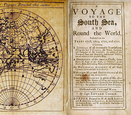 Frontispiece of “A voyage to the South Sea and Round the World”, which includes a firsthand account of castaway Alexander Selkirk’s adventure, written by Edward Cooke, published in 1712.