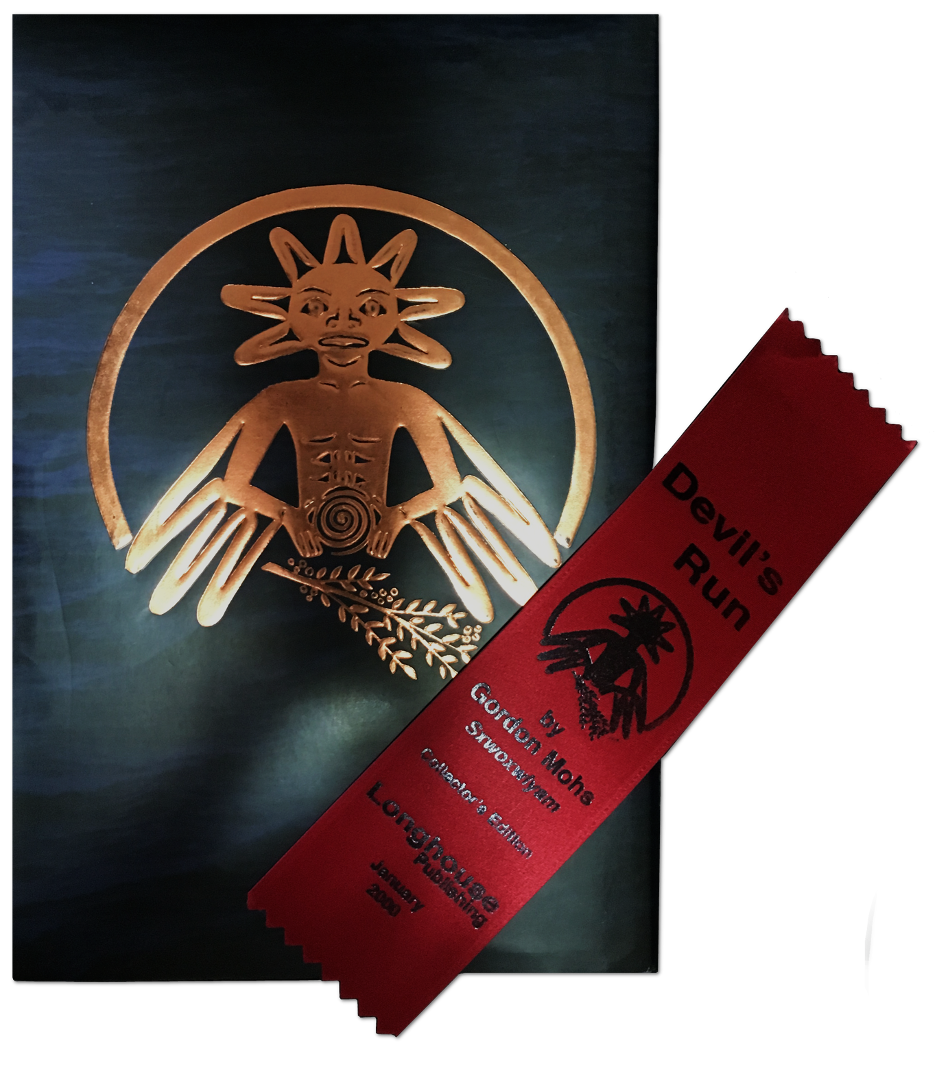 Front cover of “Devil’s Run”, by Gordon Mohs (Longhouse Publishing, Mission, BC, 2000, 361 pp.) It’s a lovely print job, from the illustrations, to the quality place marker and the copper-embossed covers. And not a grammar or spelling mistake anywhere in the novel. And I looked for them!