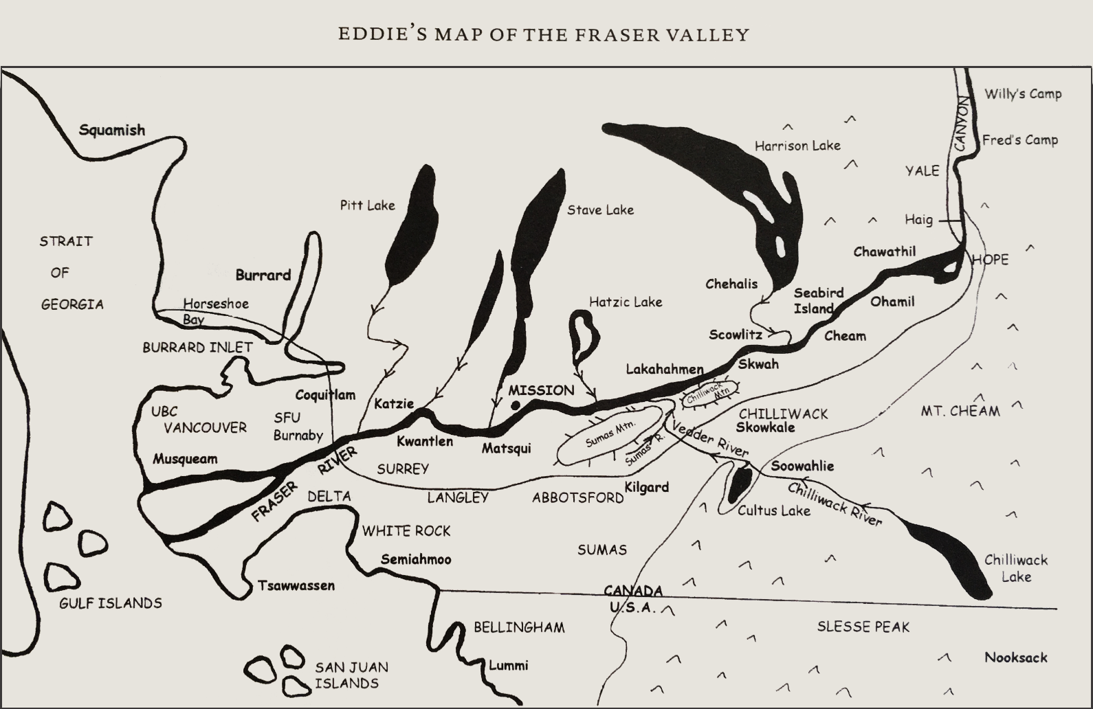 “‘How’d you guess I wasn’t Stalo?’ Eddie asked. ‘First off, you’re too tall. You look like you’re from the Interior. But if you were Stalo, or raised around here, you’d know that it was the Sumas River, not the Vedder that flows into the Fraser at Devil’s Run.[…] ‘That’s all very interesting, but I don’t see what this has to do with Devil’s Run.’ ‘To know Devil’s Run, you’ve got to know about the Sumas and the sturgeon,’ Russell replied.” (p. 58)