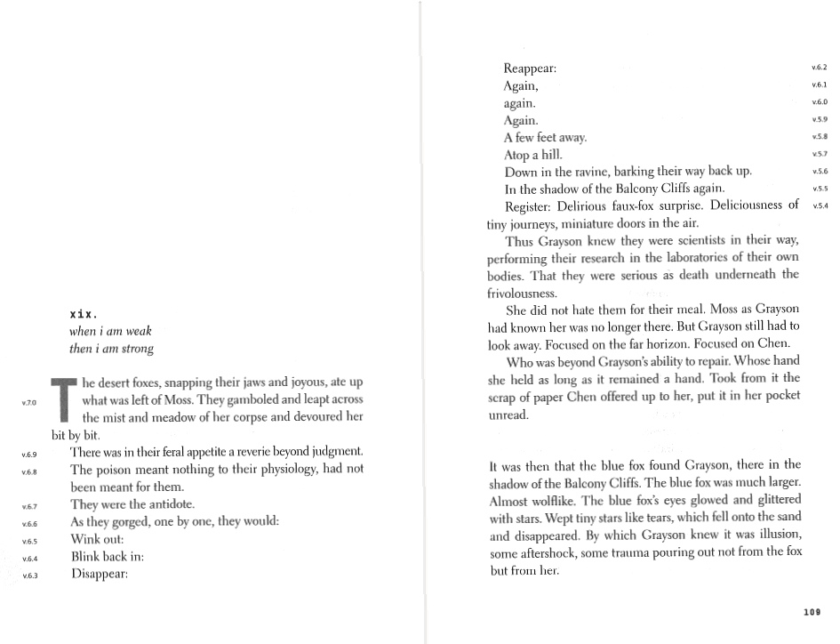 The number sequence is one way in which VanderMeer uses typesetting, layout, and also hand-drawn illustrations, to reinforce the tone and meaning of the text, like on these pages, below – note the numbering in the margins which counts down to “v.0” in the last chapter, which is also numbered “0”.
