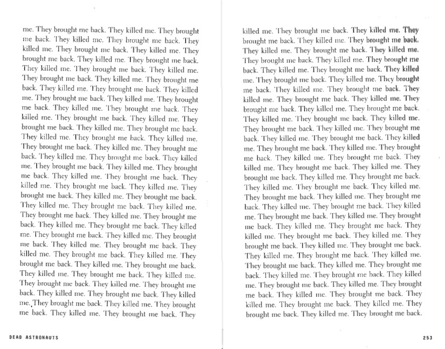 On the left, above, are two of the four-and-a-half pages of the same words, spoken by “the murderous child”. I thought this narrator was the scientist called “Charlie X”, whose father killed him and brought him back from the dead, over and over, as part of the experiments done at “the Company”: “My father always said, ‘Make this into a lesson or I’ll kill it. And you. Again.” The “massing” of the text has a strong effect – the repetition of just two sentences: “They killed me. They brought me back.”