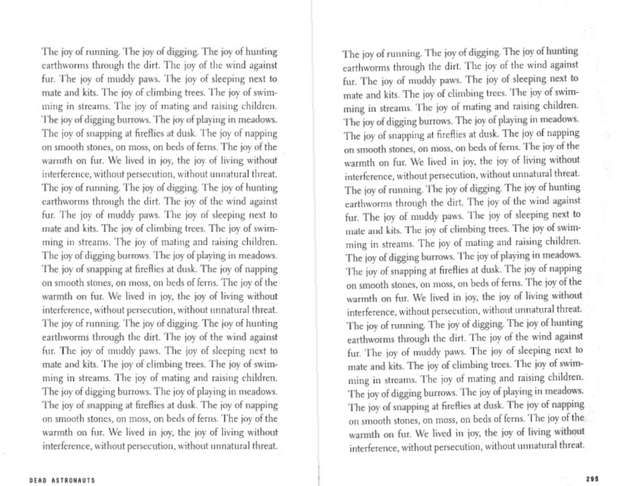 And in yet another chapter further on, called “to the children I loved”, (above, right), is a list of repeated things, simple things, that foxes do. If they could speak, this is what they would say. The foxes in Dead Astronauts are simple animals, they jump, play, chase and basically just live free and do as foxes do. But we all know what people do to foxes in this world…
