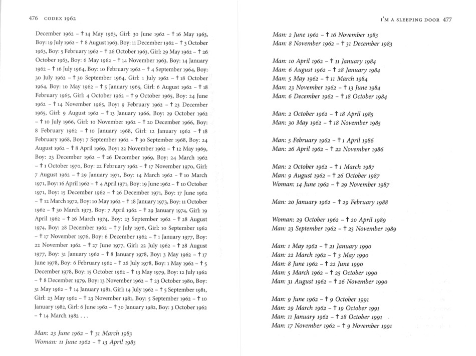 Extract of pages with lists of the dead, from CoDex 1962, by Sjón.