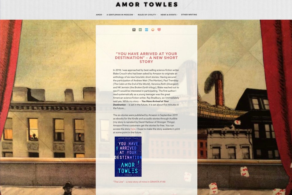 This is old news that I wasn’t aware of until now: Amor Towles, the author of the bestseller A Gentleman in Moscow, brought out a new short story last year, in a collection with other authors called You have Arrived at Your Destination. The stories can be read in any order, they were published on the same day, It is only available as an e-book. How it was written and published is explained on Towles’ website, below: