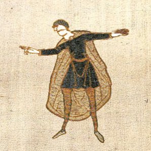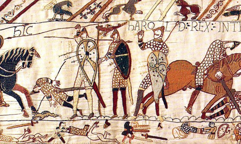 A scene from the Bayeaux Tapestry – it is believed that the figure 4th from the right, with the elaborate shield, is King Harold, holding on to the arrow he got in his eye, which killed him. The words embroidered above his figure are: Harold Rex interfectus est, “Harold the King has been killed”.