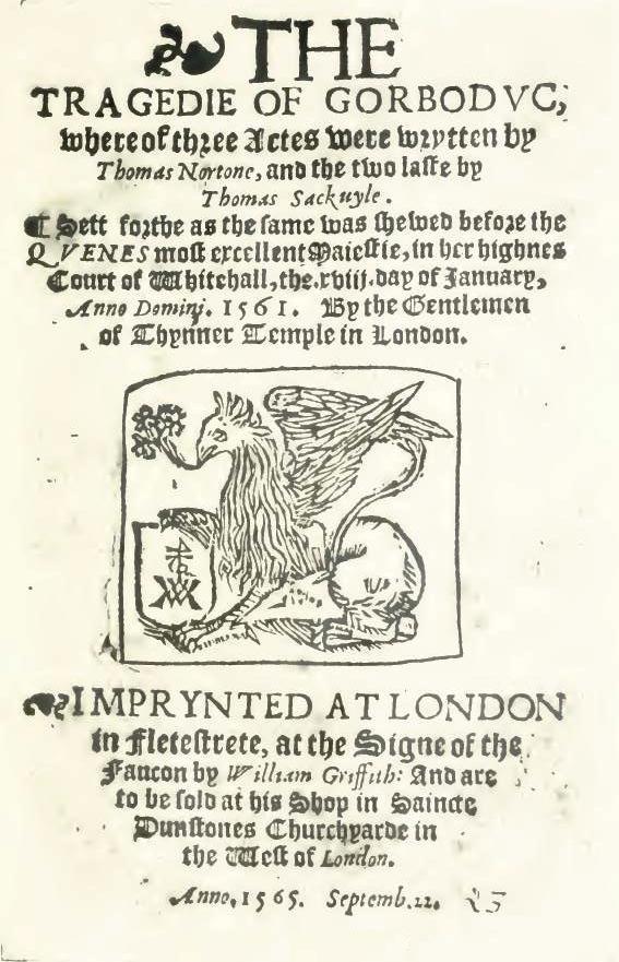 “The Tragedie of Gorbodvc, whereof three Actes were written by Thomas Nortone, and the two laste by Thomas Sackuyle. Sett forthe as the same was shewed before the Qvenes most excellent Maiestie, in her highnes Court of Whitehall, the .xviii. day of January, Anno Domini .1561. By the Gentlemen of Thynner Temple in London.”