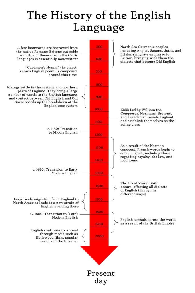 This image shows the history of the English language, from the time Germanic tribes began settling in Britain to the present day. It represents a broad consensus view of the history of the language. As such, fringe notions (such as English being a creole with French or Norse, English being a North Germanic language, and the “Celtic Hypothesis”) are not included. (Excellent work by Wikipedia contributor “CelticBrain”, created: 17 April 2020)