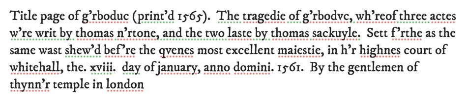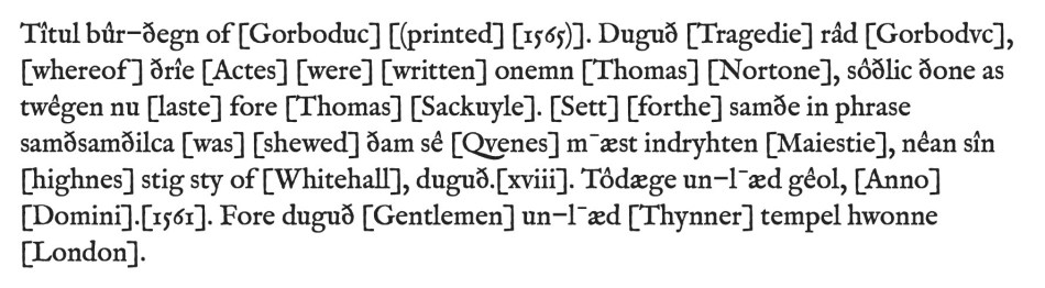 This example, below, is a rough translation into Early Modern English of the same text as above, the title page of The Tragedy of Gorboduc.