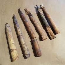 Above, left to right: Tallow candles, made with animal fat; buskin boots, half-length, with front lacing and open toes – you might have seen those in films set in Ancient Rome; Medieval painting showing archers with English longbows made of yew wood.