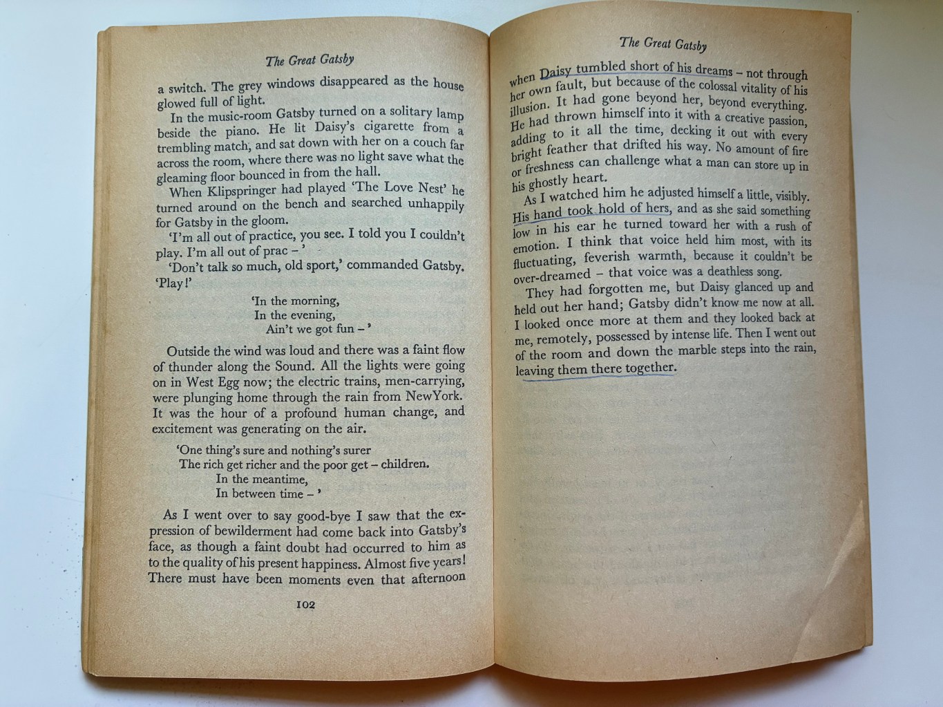 I have a dog-eared, well-read second-hand copy of The Great Gatsby, in which the previous owner had underlined random sentences. But even that unknown reader had noticed the significance of this moment, and the last line.