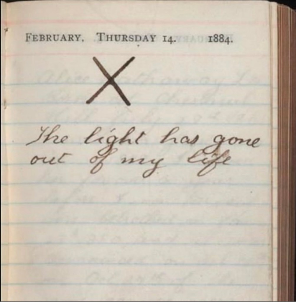 This is the only diary entry he made on that day. He wrote a hard-lined “X” with his ink pen, seemingly in anger at what has been crossed out. Then, “…gone out of my life”. Roosevelt described Alice as sunshine, as his light, so that the light that had gone, was Alice. But for that moment, all he could express was his own grief. And, there is no period at the end of this sentence, as if he were not only distracted by his pain, but unable to foresee the end of it.
