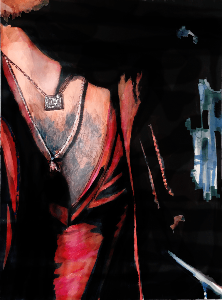 The top painting, which goes with “Who Made You”, shows only a man’s chest. I wanted it to look sensual, though behind the façade of desirability, the sitter is also just a man, flesh and blood. I had the portraits by John Singer Sargent on my mind when I did this one.
