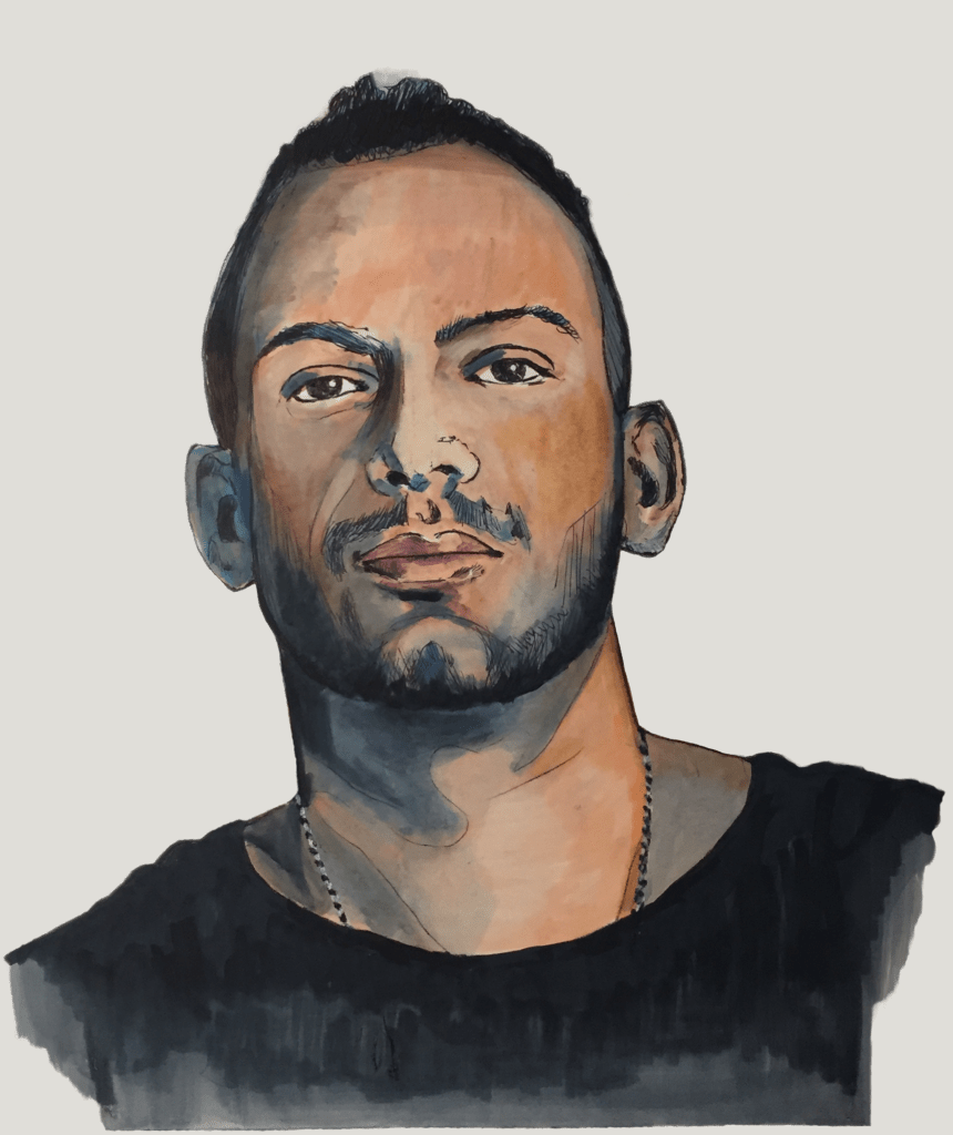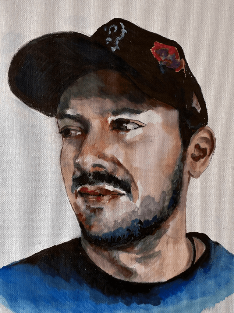 The painting with “The Journey” shows the subject wearing a baseball cap. I’d always thought he just likes wearing caps. But he’s explained that the caps, and the rest of the clothes that he usually wears – low-ride jeans, sneakers, hoodies – identify him as a House music artist. It’s a genre aesthetic: caps align the wearer with the look or vibe of a particular music scene or movement, in this case, House.