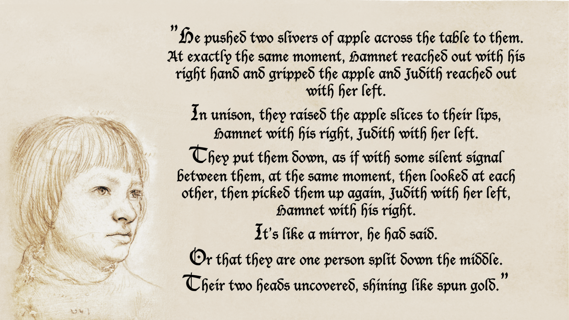 Judith raises the twins on her own. They grow up to be mirror images of each other. They look alike, with blonde hair, they are always together, they are connected with a love so strong that one cannot live without the other. Hamnet is right-handed, Judith is left-handed.