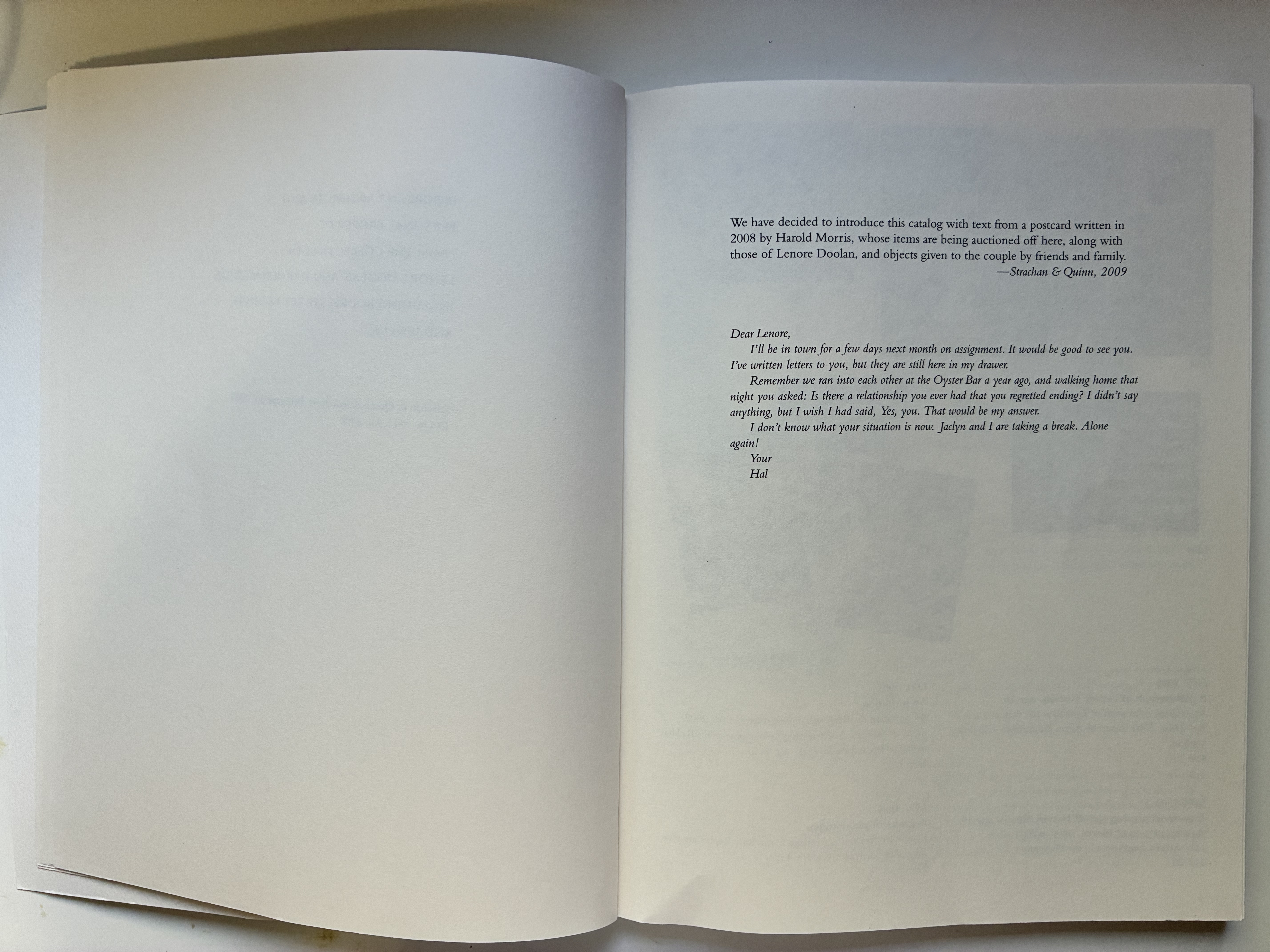 When you flip through it, what you see are pages of black and white captioned photos, or just captions, of the flotsam and jetsam of a relationship. The photos of the things that are evidence of the relationship are presented as they would be in the catalogue of an art auction. And, on the cover, are the words: “Strachan & Quinn Auctioneers”.
