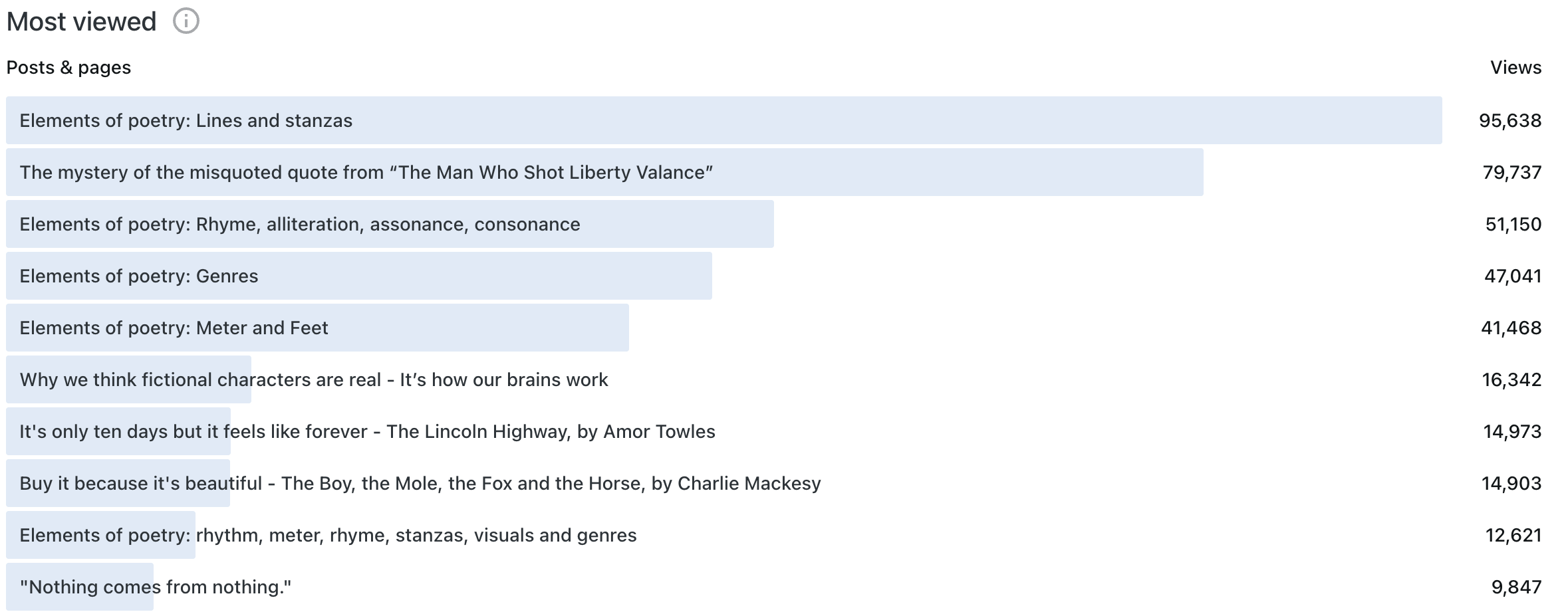 The graph, below, shows which pages and post have got the highest views of all time. It’s clear that Sevencircumstances is mainly useful as a guide to poetry – what it is and how it works. That’s not surprising. Poetry is hard to get your head around, and though many handbooks have been written about it, it is tricky to find something that is simple and easy to understand. Since I write about poetry in ways that make sense to me, it is simple and easy to understand. The other top posts and pages are about strange literary phenomena.