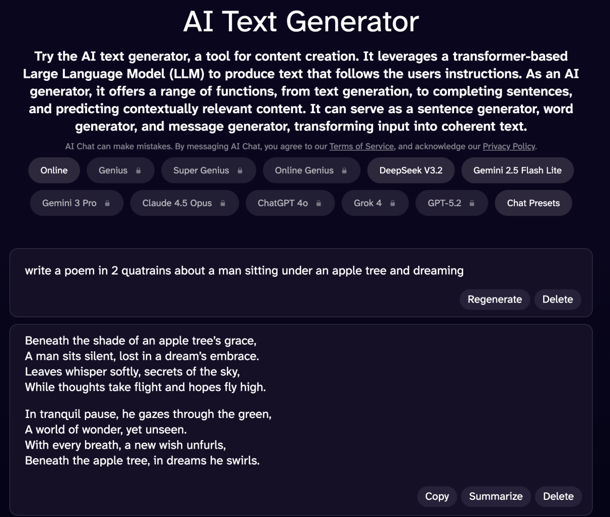 My prompt, in DeepAI Text, took the algorithm less than one second to generate a poem to spec: