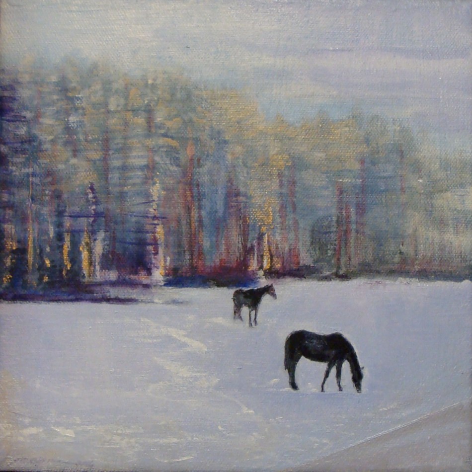 Horses Seen From the Car If you blink, they're gone, the black shapes in the snow in the field in the window – Tumbling “E”s on eye charts. Close yours and you get it wrong. That was no horse, that was a shed of sorts, propped up in the clearing, against the fence. No, look back, it moved, it noses the grass makes a small puff as it treads forward. Or perhaps it was just one more letter misread on the frozen page while speeding by.