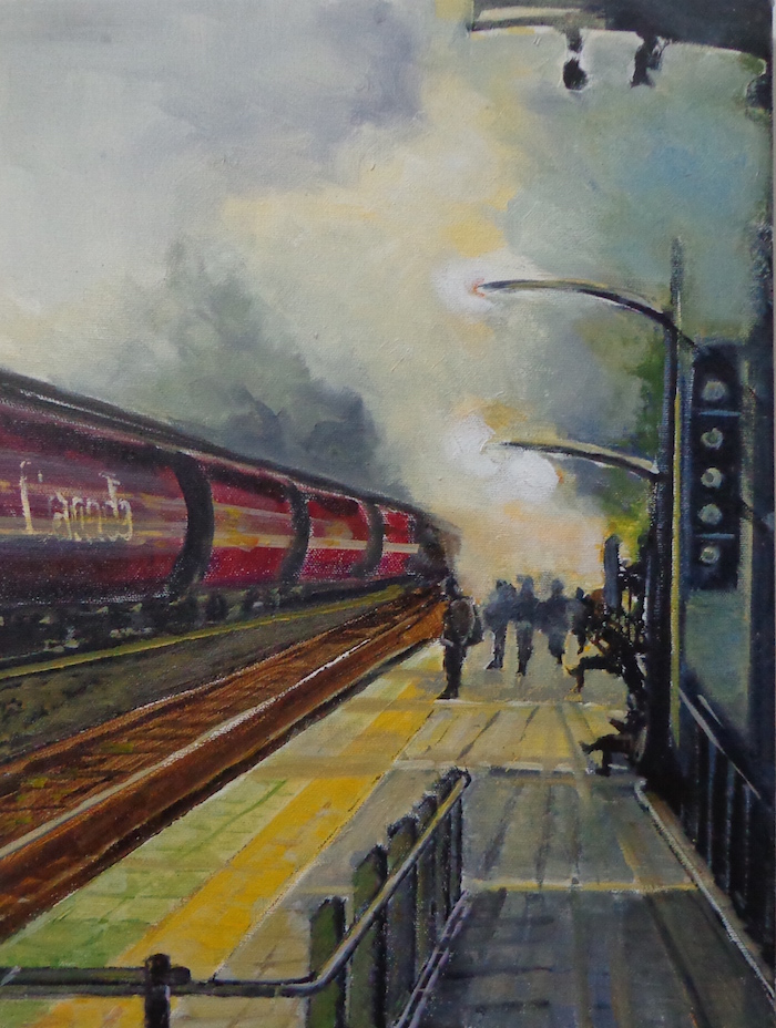 At the Station This morning, ghastly yellow, the train howled past, into the fog, another emerged from the depths like a tree floating up from a bog. Lights like gassy blobs in the murk, People’s blurry silhouettes. The ochre light of pre-dawn drifted down in smoky pirouettes.